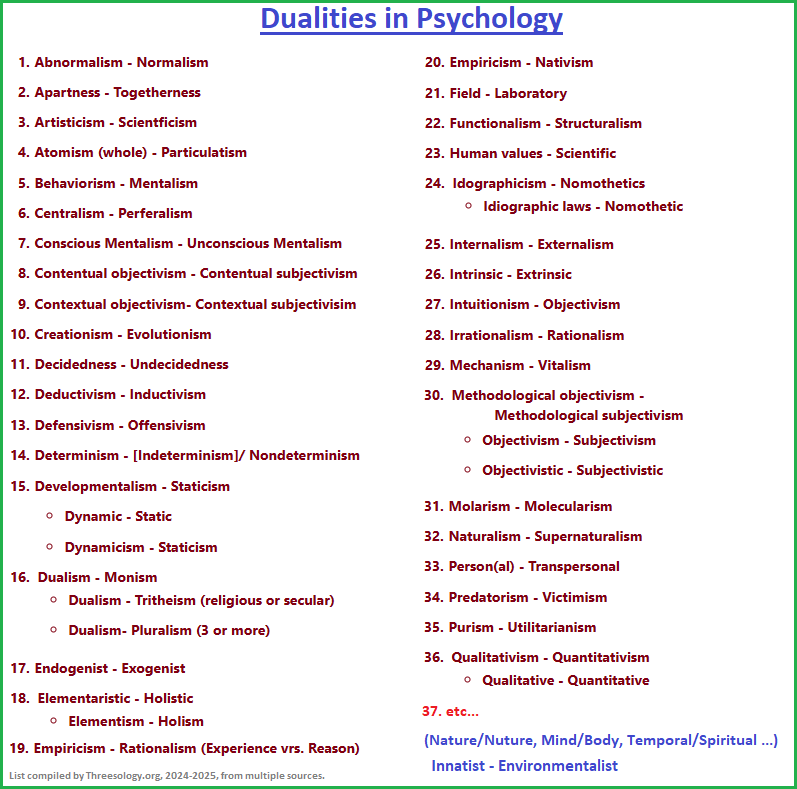 With the Sun and its three daylight phases (dawn-noon-dusk) influencing religious and metaphysical thought as a focally directed orientation following on the heels of pluralistic Nature orientations, we find a development of religion exhibiting a sequence... over time in the model of: from the plural to the dual to the tritheistic and then monistic, the latter sometimes represented as a 3-in-1 compartmentalization such as the Christian trinity and Hindu tri-unity/Trimurti of Brahma-Vishnu-Siva. The former reptilian-like self-survival enacted preoccupation gave way to egotistically described personalization of oneness with oneself, with others, and an over-valuation labeled as a "chosenness" of people, presence, purpose, extended to a piece of real-estate called a chose land. By using this procession of a change in human cognition taking place over time, the use of enumeration helps us to plot changes that might otherwise be overlooked. However, the use of enumeration might falsely lead some to consider that there will be a continuation in a numerical sense, and not the adoption of a developmental sequence beyond mere enumerative values that many readers have not even considered.