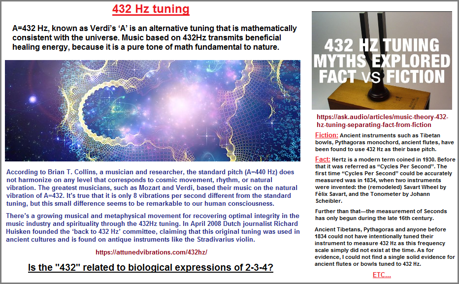 Is a metaphor of the "2-3-4" pattern-of-three to be found in the debate surrounding the 432HZ idea in music theory and its supposed relationship to some healing property important for human consciousness and other physical states? Yet, the 432Hz is companioned with two others (440, 528), thus yielding a trinity of tuning frequencies; all of which when subjected to various mathematical derivatives (such as addition, subtraction, multiplication, division...), will yield varying combinations related to other patterns to be found in multiple subjects, but is a digression not being traced out in the present discussion.